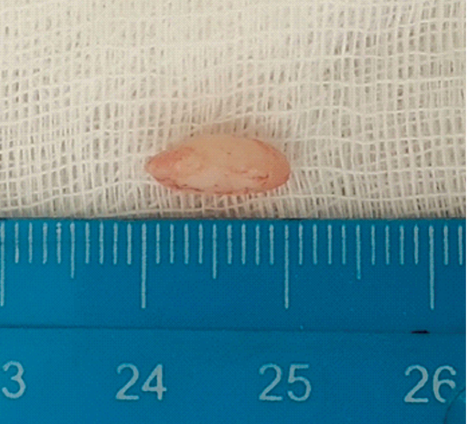 Было принято решение удалить инородное тело дна полости носа под эндотрахеальным наркозом с использованием видеоэндоскопической аппаратуры, риноскопа d=4мм 0°, 45°. При помощи скальпеля выполнен разрез слизистой оболочки дна полости носа слева в передних отделах в проекции образования. Антральной ложкой и щипцами Блексли удалено инородное тело (предположительно сверхкомплектный зуб) (рисунок 4).