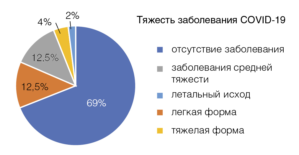 Как видно из рисунка, большинство людей к концу 2020 года еще не переболело COVID, у 12,5% наблюдалась легкая форма COVID, у 12,5% – средние формы. Тяжелые формы заболевания были у 4%, и у 2% был летальный исход.