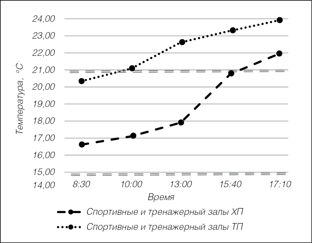 Рисунок 2. Динамика изменения температуры воздуха в спортивных и тренажерном залах в течение учебного дня. Примечание: двойным пунктиром обозначены верхняя и нижняя границы допустимых нормативных значений для холодного периода года. / Figure 2. Dynamics of air temperature in sports halls and workout rooms during the school day.