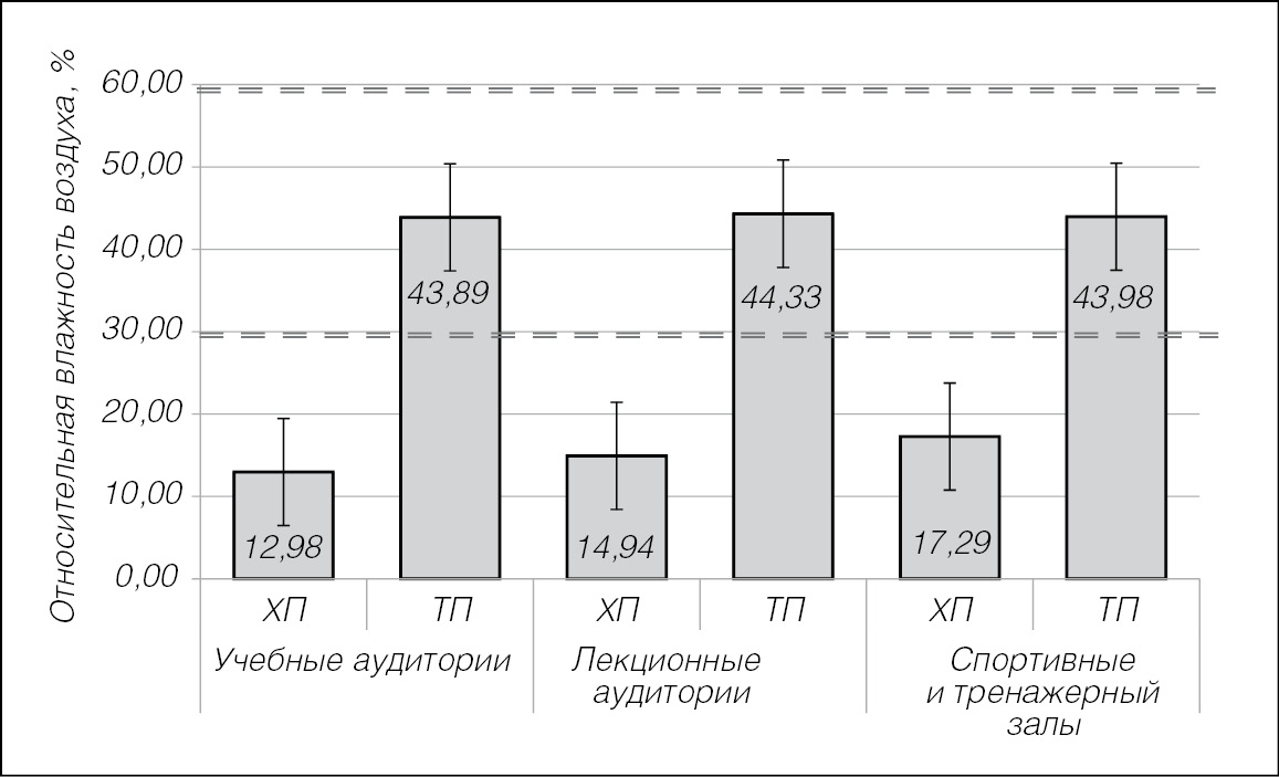 В холодный период относительная влажность воздуха была значительно ниже допустимых значений: в учебных аудиториях не превышала в среднем 12,98±1,91%, в лекционных – 14,94±2,39%, в спортивных и тренажерном зале – 17,29±4,22%.