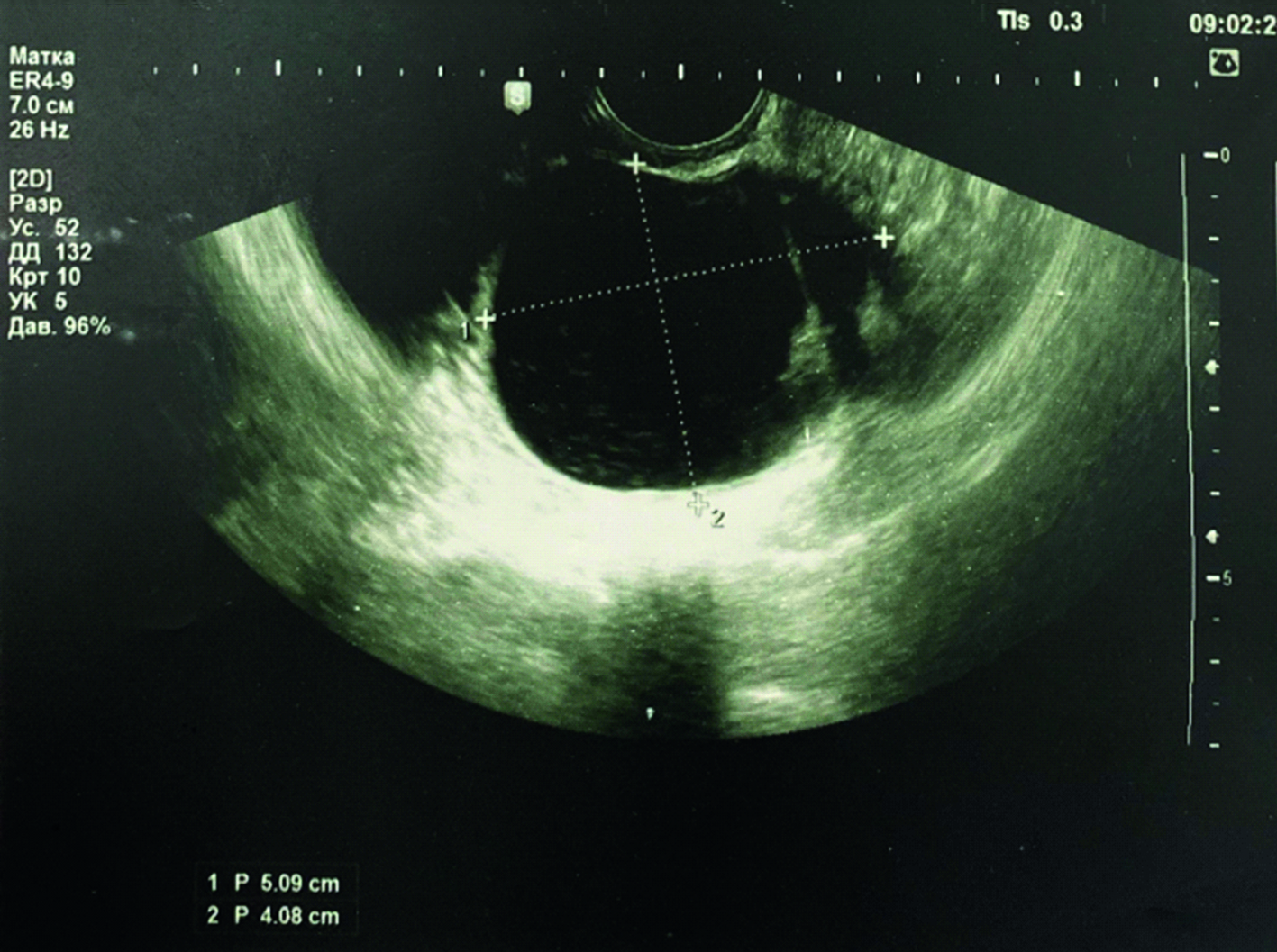 Рисунок 1. Ультразвуковое изображение пациентки с подозрением на рак правого яичника.