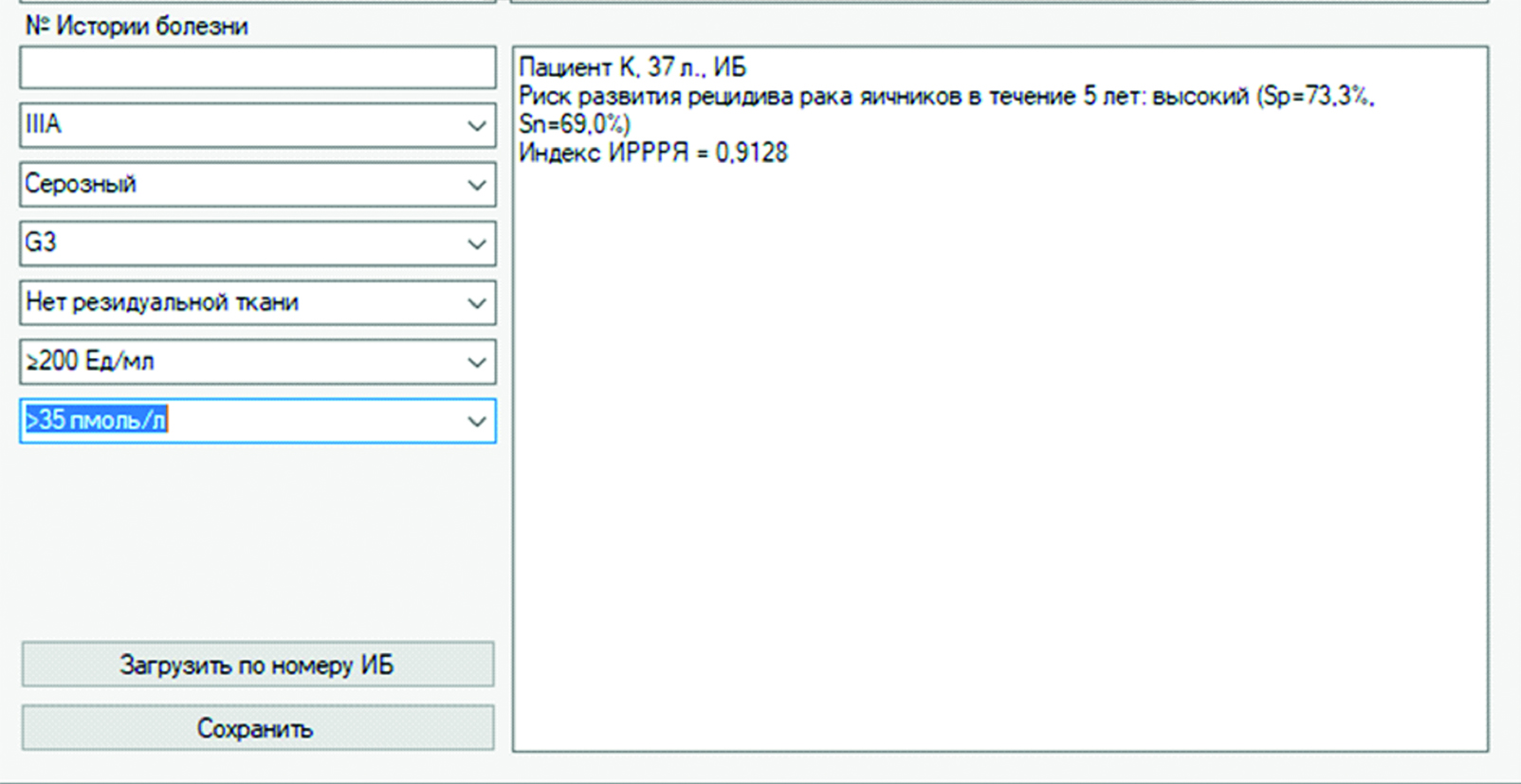 Так как расчeт был произведен ретроспективно, в момент подготовки настоящей рукописи, то возраст пациента в программе указан как 37 лет, а не как 32 года, как на момент поступления. В левой части рисунка 2 можно рассмотреть вводные данные, соответствующие истории болезни пациентки. В белом поле высвечивается расчетный риск, в данном случае – 0,91, что означает, что у данной пациентки высокий риск рецидивирования в течение 5 лет после завершения терапии первой линии. Также указывается чувствительность – 69% и специфичность – 73,3% данного прогноза.