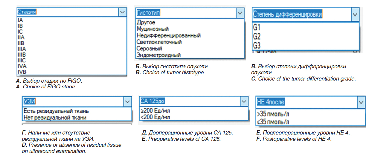 В качестве исходных параметров программы задаются следующие показатели: стадия заболевания по FIGO (International Federation of Obstetrics and Gynecology) (рисунок 3А), степень дифференцировки опухоли (рисунок 3Б), гистотип (рисунок 3В), наличие или отсутствие остаточной опухоли на УЗИ после лечения (рисунок 3Г), значение уровня онкомаркера СА-125 до начала лечения (рисунок 3Д), значение уровня онкомаркера НЕ-4 после лечения (рисунок 3Е).