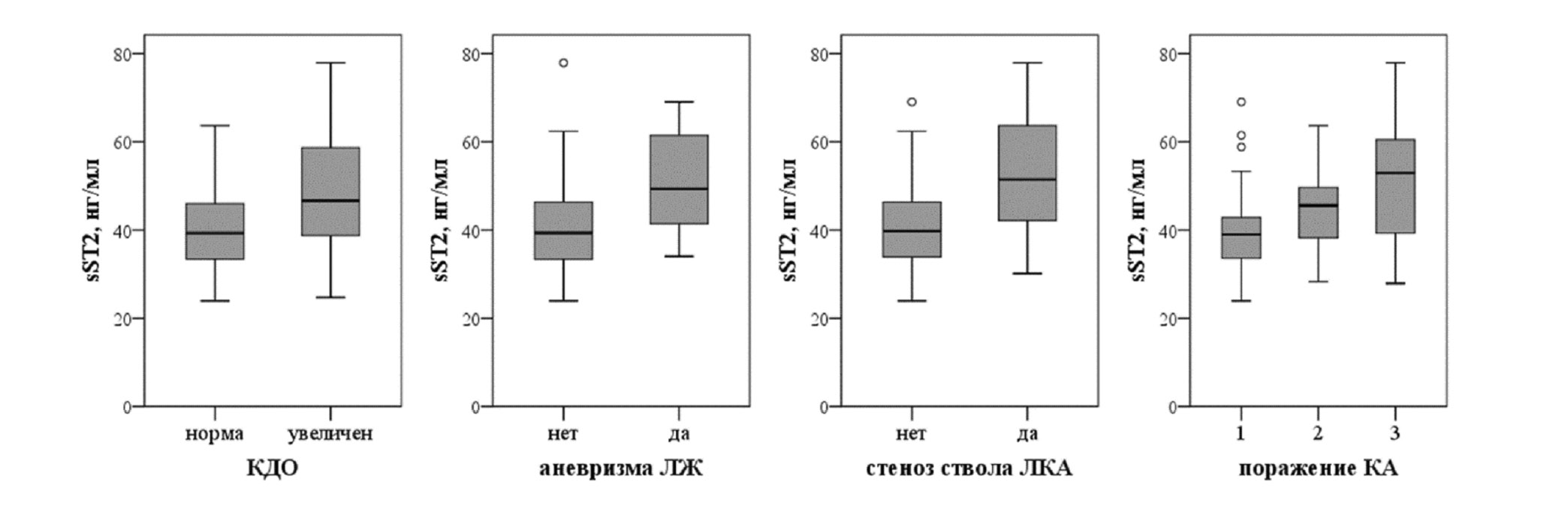 Рисунок 1. Содержание sST2 в зависимости от показателей ЭхоКГ и КАГ.