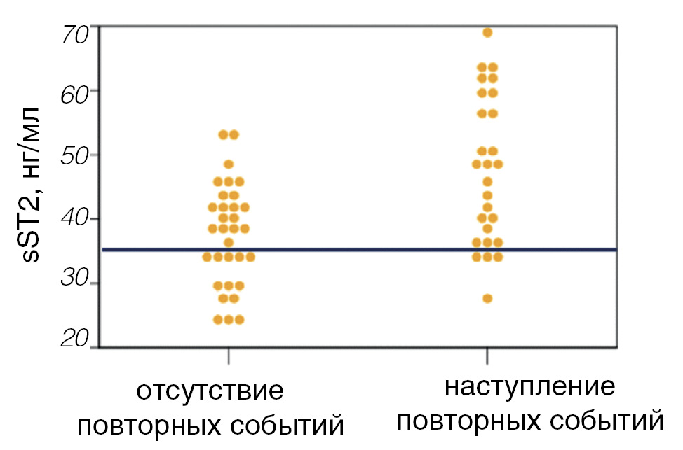 В качестве порогового значения, ассоциированного с наступлением неблагоприятных событий, в настоящее время предложено рассматривать содержание sST2 ≥35 нг/мл [5, 6], что сопоставимо с результатами проведенного нами исследования. У пациентов без повторных событий медиана sST2 составила 39,14 нг/мл, у пациентов с повторными событиями – 47,99 нг/мл. ОШ для порогового значения биомаркера ≥35 нг/мл – 3,93.