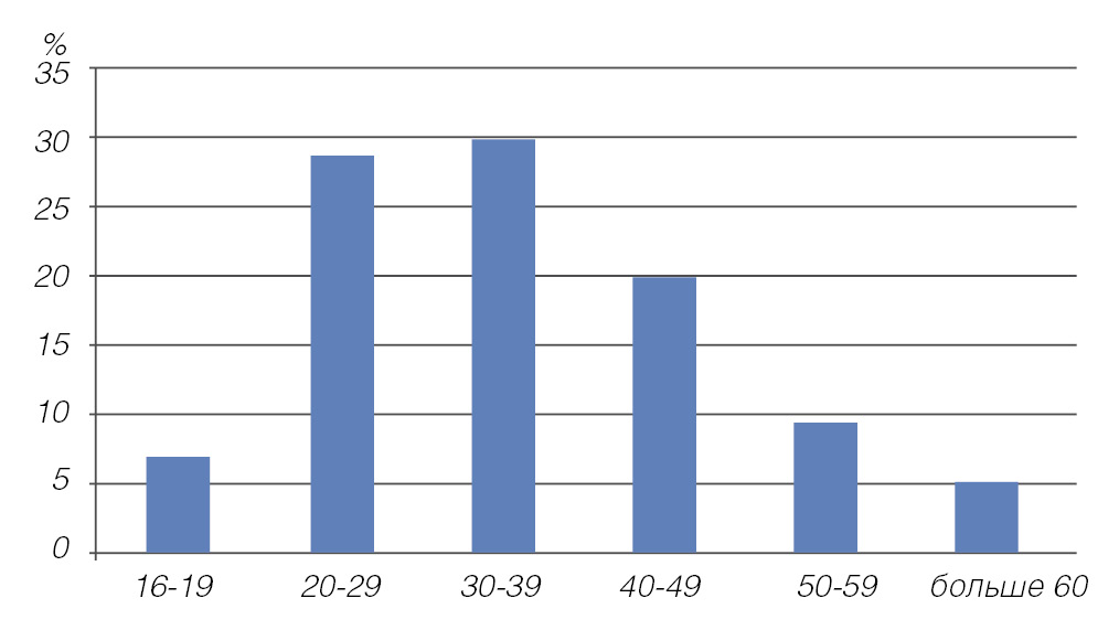 Все участники опроса были распределены по шести возрастным группам: 16–19, 20–29, 30–39, 40–49, 50–59, 60 лет и более. Средний возраст посетителей составил 36,7 ±11,4 года.