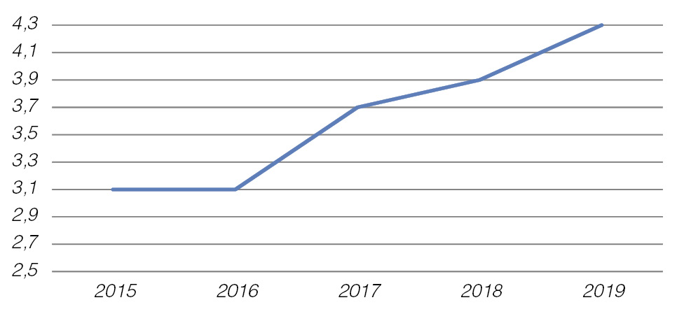 Рисунок 2. Среднемесячное посещение посетителями фитнес-центра 2015–2019 гг.