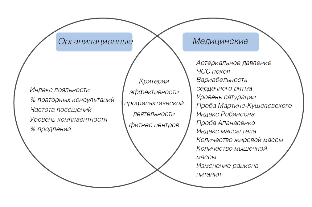 Учитывая, что существенный процент посетителей нуждается в получении профилактической помощи по профилю «неинфекционные заболевания», для оценки эффективности профилактической деятельности фитнес-центров нами предложены два вида показателей, а именно: медицинские – касающиеся здоровья посетителей и организационные – относящиеся к деятельности самой организации (рисунок 3).