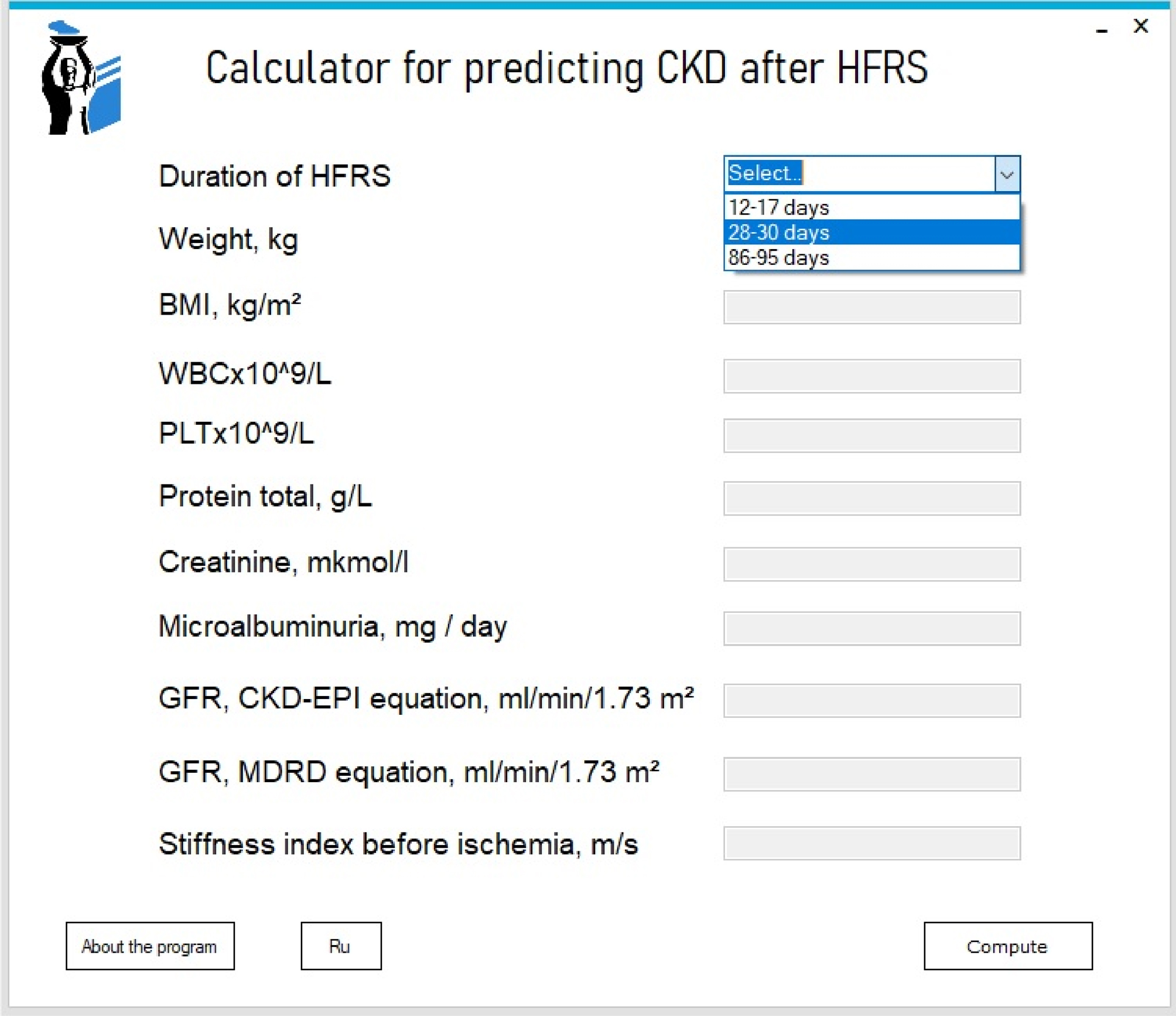 Рисунок 1. Стартовое окно программы Calculator for predicting CKD after HFRS с выпадающим нередактируемым списком сроков ГЛПС и неактивированными текстовыми полями.