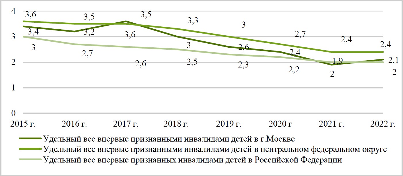Вместе с тем, из рисунка видно, что показатели наглядности в целом за 8 лет (в 2022 г. по сравнению с 2015 г.) в Москве составили 68,9 %, в ЦФО – 73,3 %, в РФ – 74,6 % соответственно. Большее снижение численности впервые признанных инвалидами детей вследствие ВПС в Москве обосновано, по нашему мнению, большей доступностью медицинской помощи детям, в частности, доступностью диагностики и высокотехнологичной медицинской помощи [13, 14].