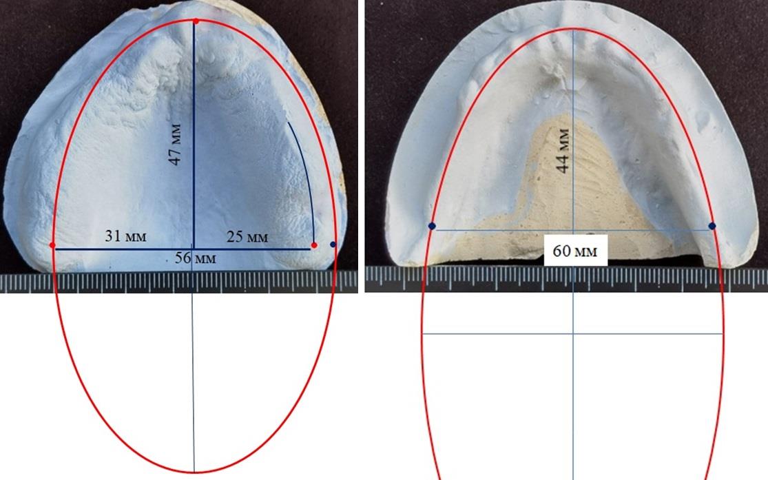 Биометрию альвеолярных дуг проводили на фотографиях моделей при масштабе 1 : 1. Особое место занимало графическое построение оптимальных шаблонов альвеолярных дуг по прогнозируемым размерам, с учетом индивидуальности лицевых параметров. Шаблоны дуг совмещали с фотографиями моделей и оценивали параметры соответствия/несоответствия. Формы альвеолярных дуг обеих челюстей были близки к эллипсоидам, с коротким диаметром, равным ширине альвеолярных дуг, а длинный диаметр для верхней дуги составлял удвоенную величину глубины, на нижней челюсти – трехкратную величины глубины арки. При этом графическая репродукция проходила через центральную точку дуги в переднем секторе, а в заднем отделе – через позадимолярные точки (рис. 1).