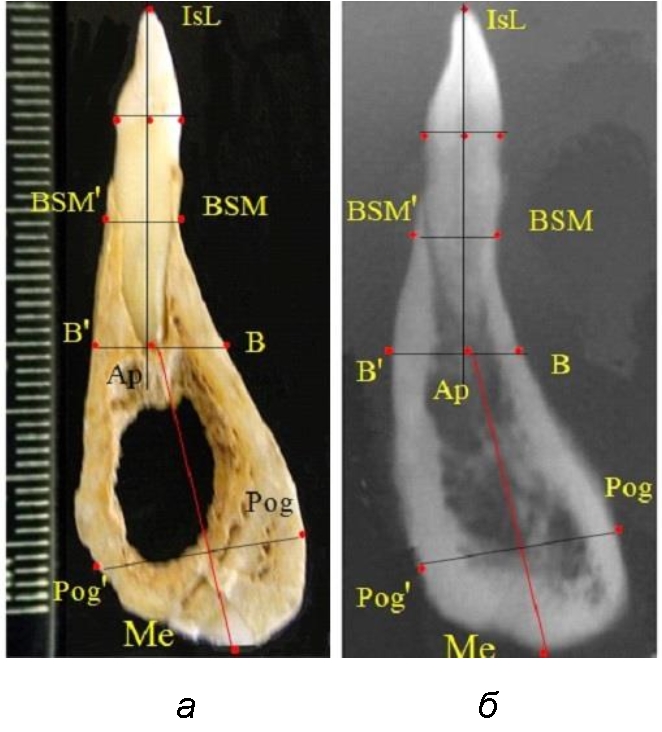 Определяли положение цервикальных точек резцов на вестибулярной и лингвальной поверхностях, которые соединяли цервикальной линией. Условная срединную вертикаль зуба соединяла резцовую точку IsL с серединой цервикальной линии и, как правило, доходила до апикальной точки, которую обозначали как Ap. Линия IsL–Ap определяла высоту зубоальвеолярной части резцового нижнечелюстного сегмента. Определяли высоту коронки и корня зуба. Кроме того, на вестибулярной поверхности зубочелюстного сегмента отмечали точку наибольшей вогнутости альвеолярной части, которая обозначалась как супраментальная точка Downs (Bsm). Измерялось расстояние IsL–Bsm, которое служило для определения проекции супраментальной точки Downs на язычную поверхность сегмента и обозначалась как точка Bsm'.
