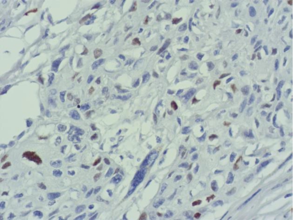 Рис. 4. Очаговая слабая и умеренная экспрессия Cyclin D1 в клетках плоскоклеточного рака языка. ИГХ окрашивание, ×400
