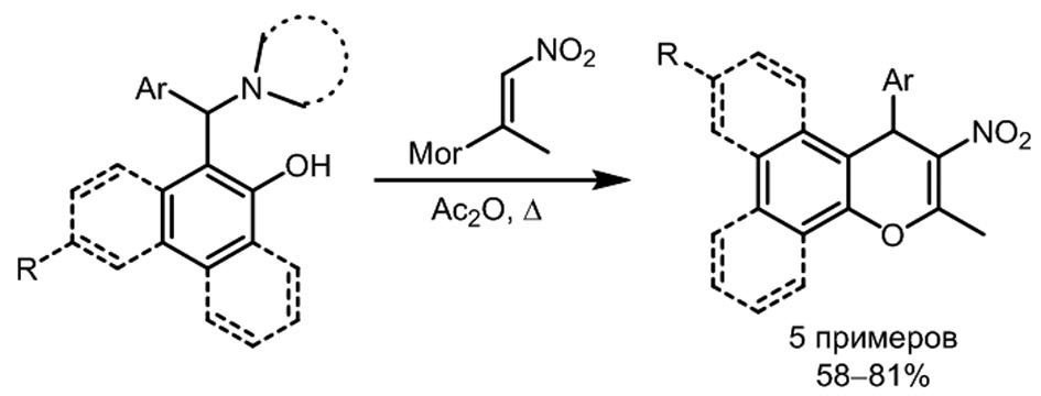 Результаты. В продолжении разработки новых способов построения хроменов был предложен новый подход к получению 3-метил-2-нитро-1Н-бензо[f]хроменов, основанный на реакции метил-2-нитровинилморфолина с основаниями Манниха. Продемонстрировано, что в реакцию способны вступать основания Манниха как из α-, так и β-нафтола, в том числе замещенные по метиленовому мостику (рис. 1).