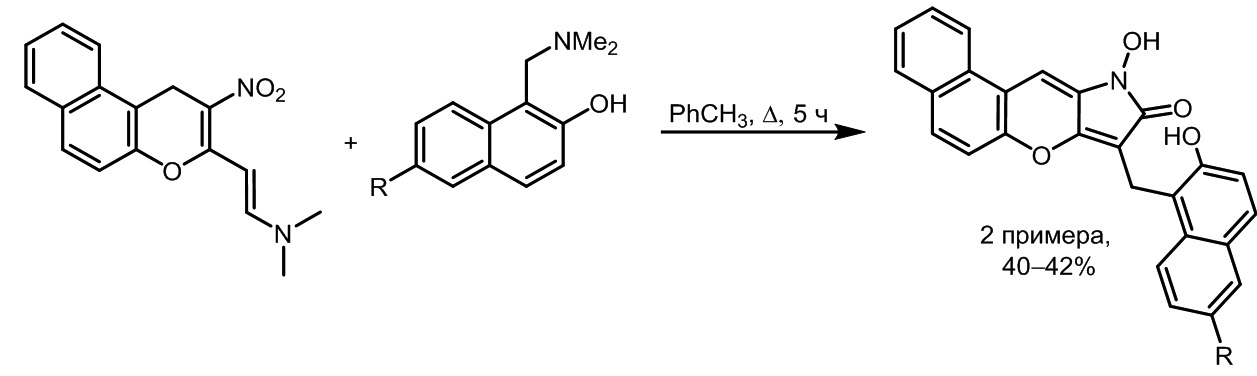 Далее нами была исследована способность α-[2-(диметиламино)винил]-β-нитробензохроменов выступать в качестве диенофилов в реакциях с о-метиленхинонами (рис. 3). Однако в реакции с основанием Манниха вместо ожидаемых продуктов реакции Дильса–Альдера — соответствующих 2’-нитро-1H,1’H-2,3’-бибензо[f]хроменов — были выделены 10-гидроксибензо[5, 6]хромено[3,2-b]пиррол-9(10Н)-оны.